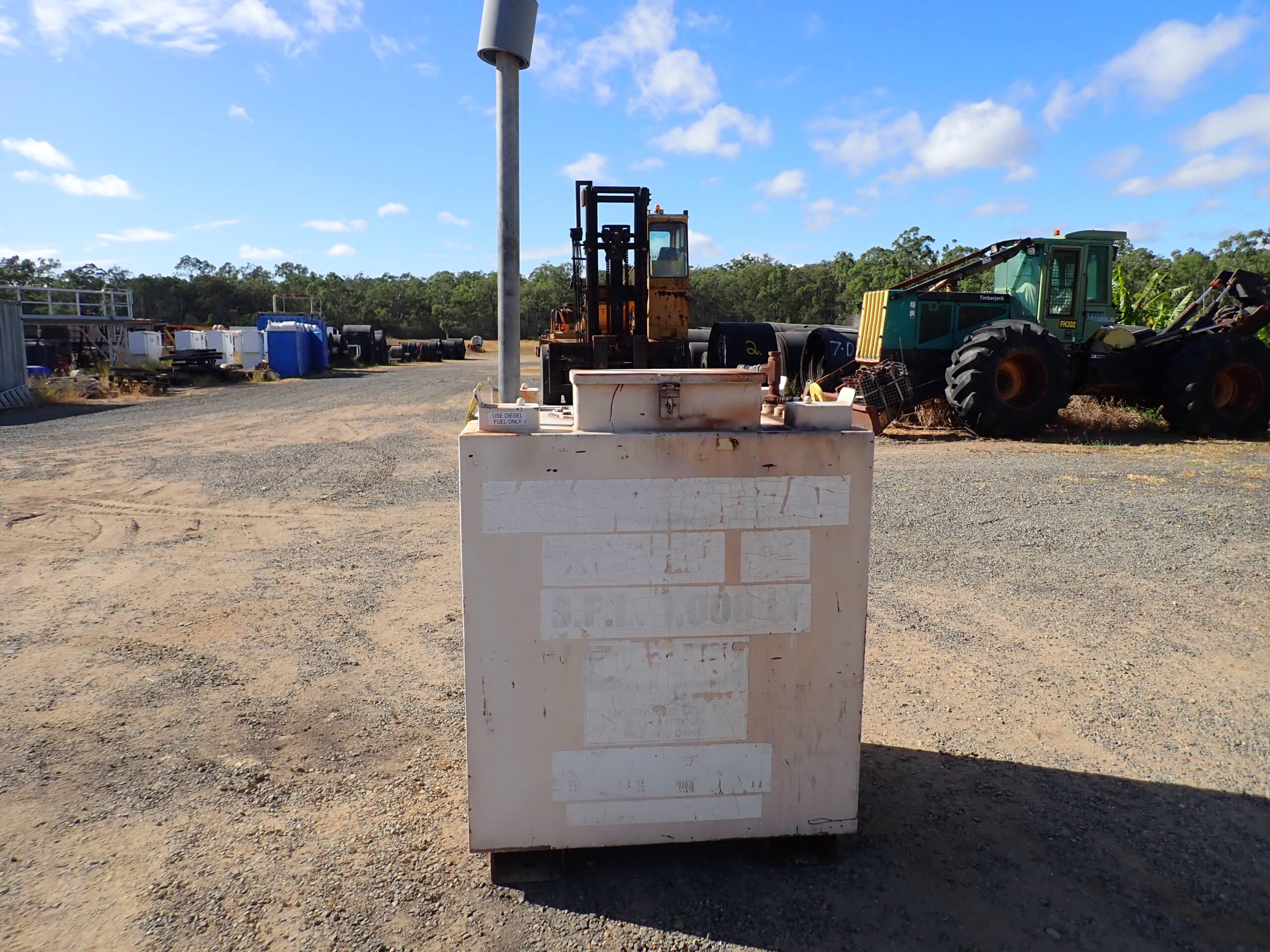 Diesel fuel tank, Transtank, 1000L safe fill, all steel construction, with forklift pockets and top lifting lugs, extended breather tube, lockable, has dip stick, good condition.