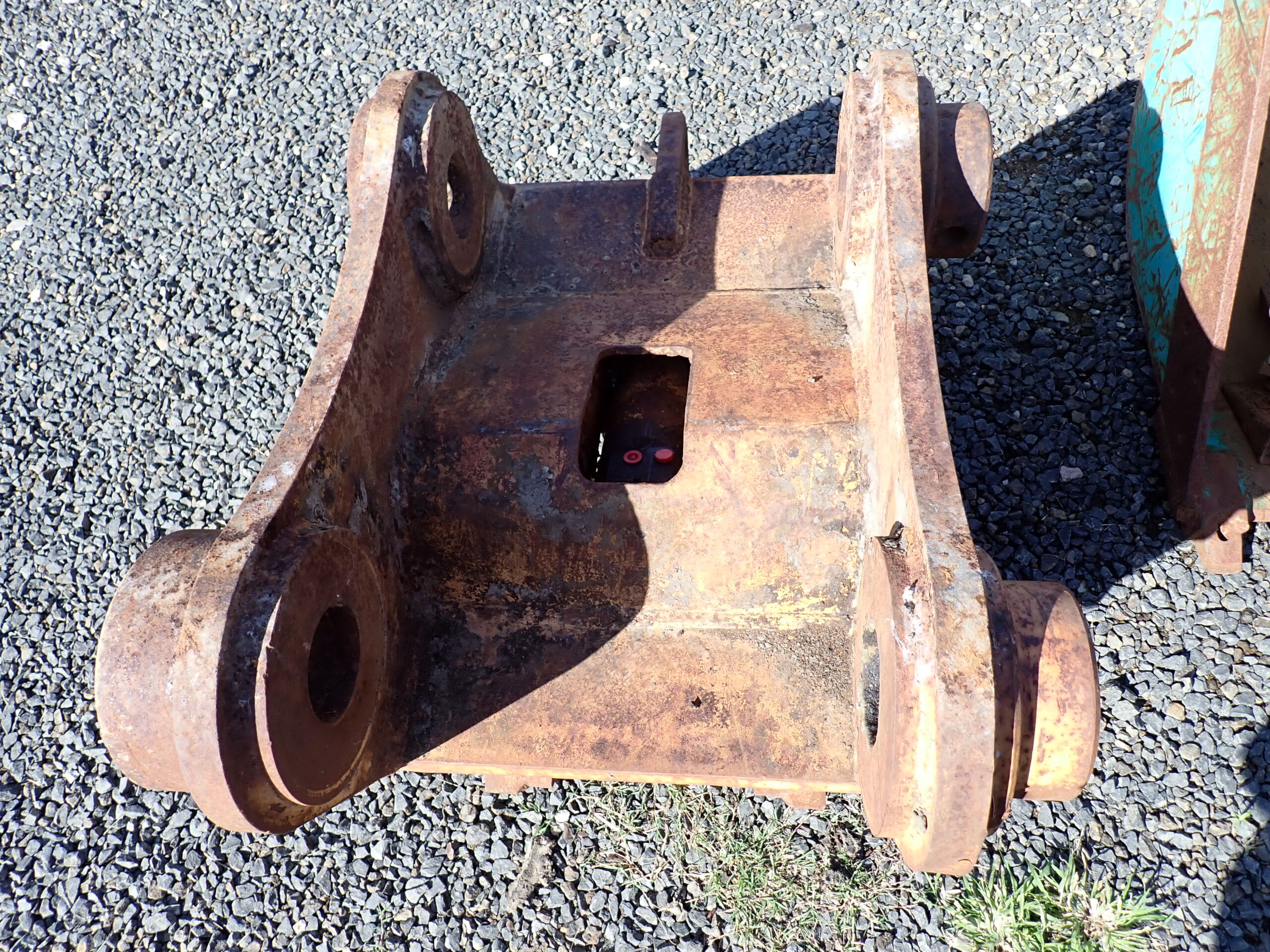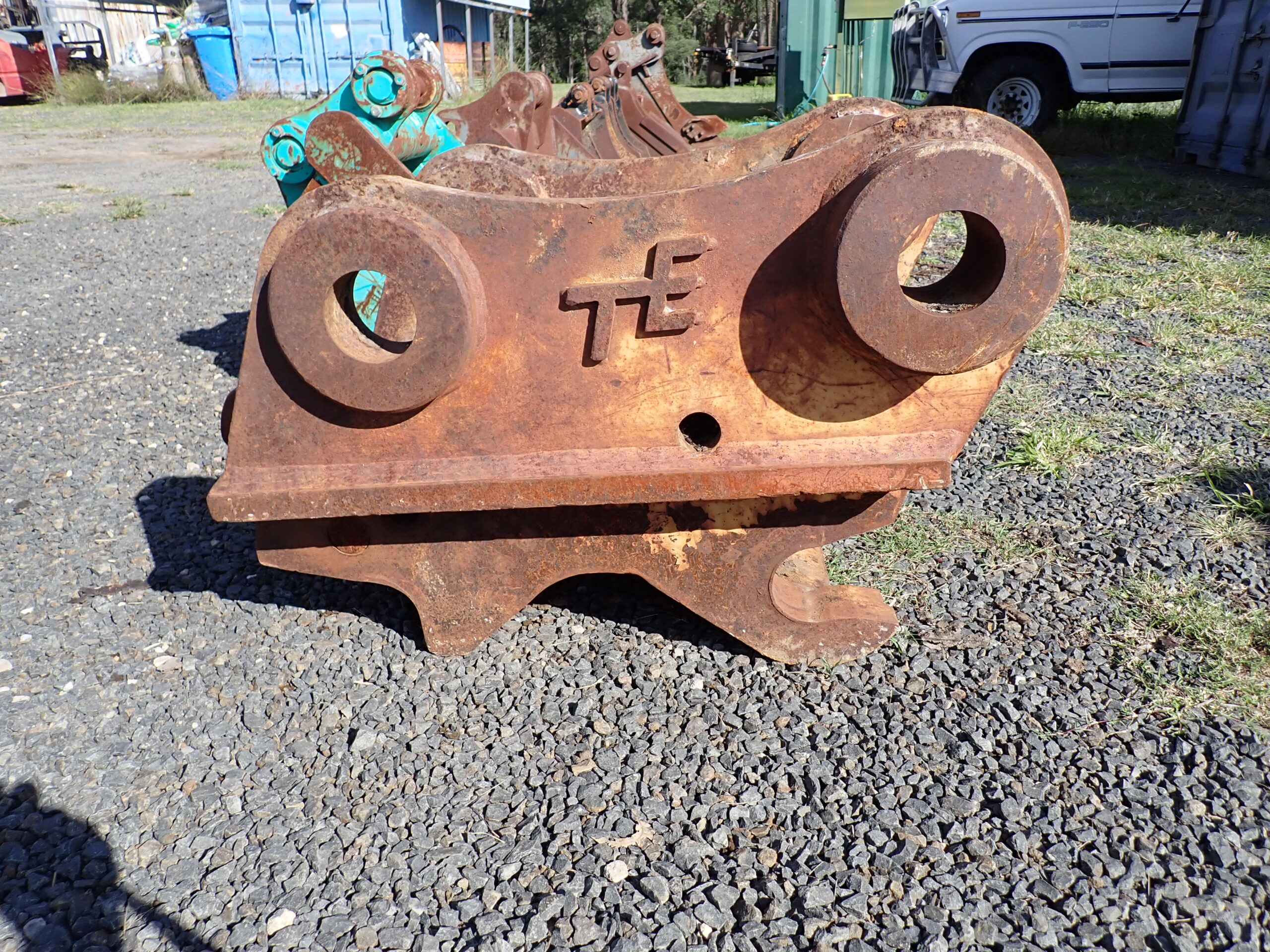 Excavator quick hitch, Turners Engineering, 535mm pin centers, 90mm diameter pins, 405mm between ears, suit 25 to 35 ton excavator, appears to be in good condition.