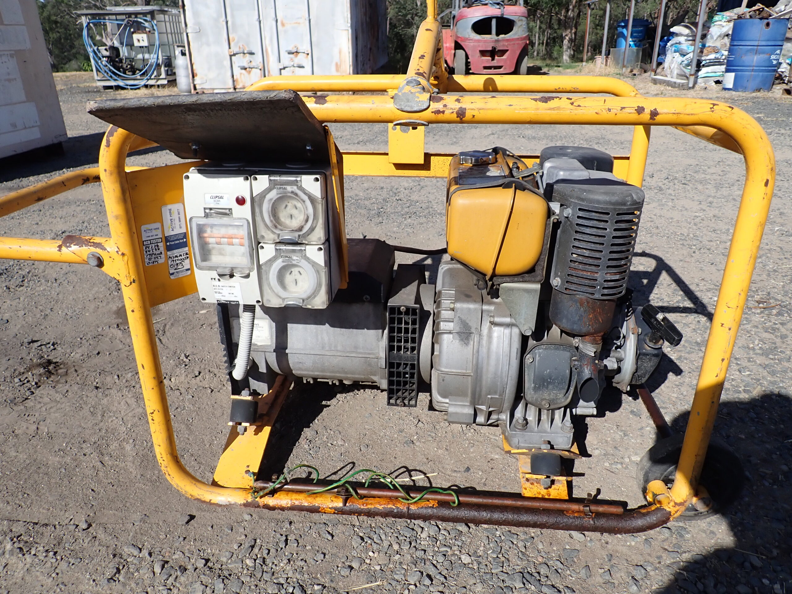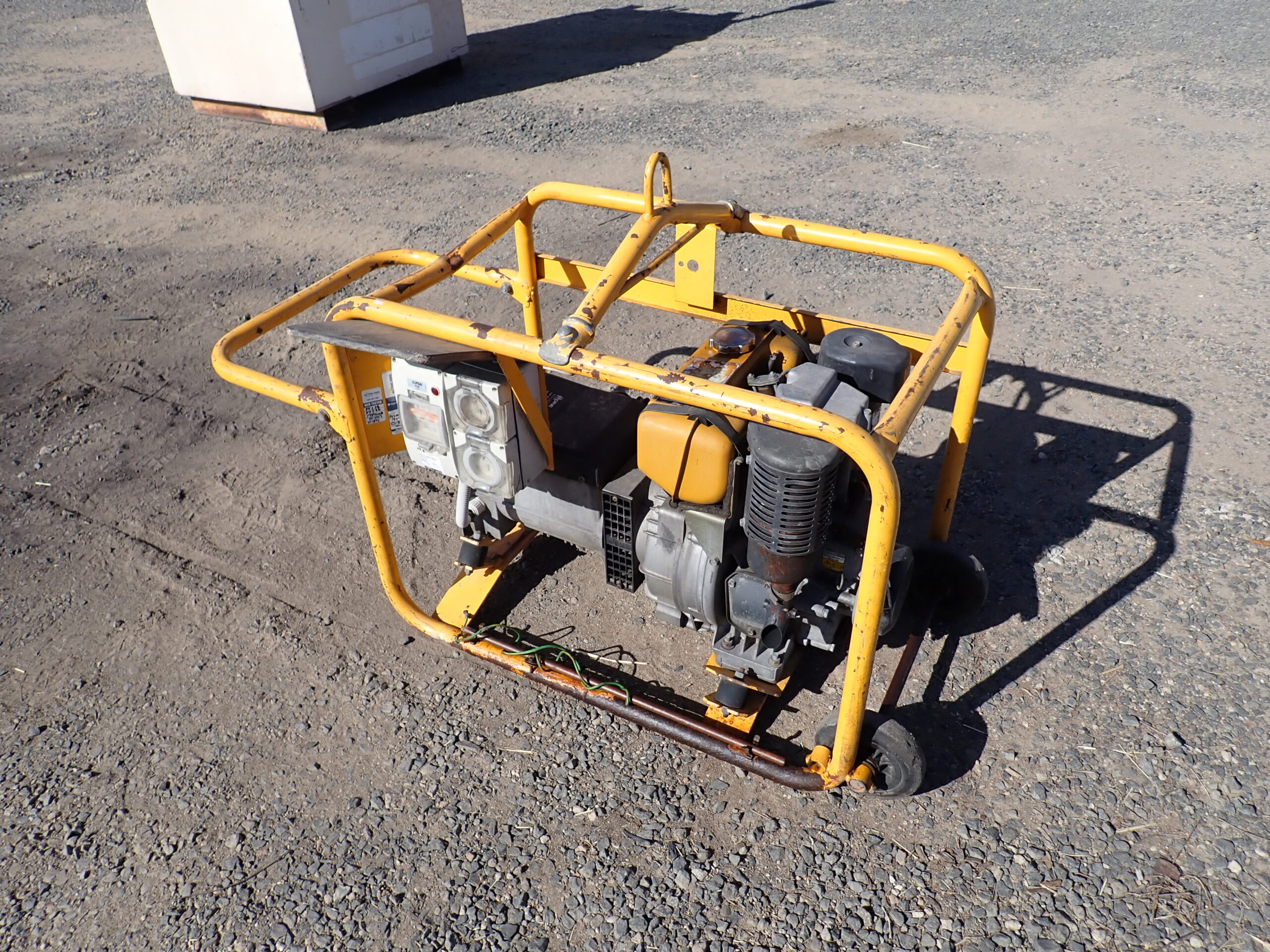 Generator diesel, Crommelins 5.6KVA, electric or pull start, Subaru/Robin diesel, in carry frame with 2 wheels and folding handle, top lifting lug, 1 x 10 Amp and 1 x 15 Amp 240 Volt outlets with RCD, starts and works well.